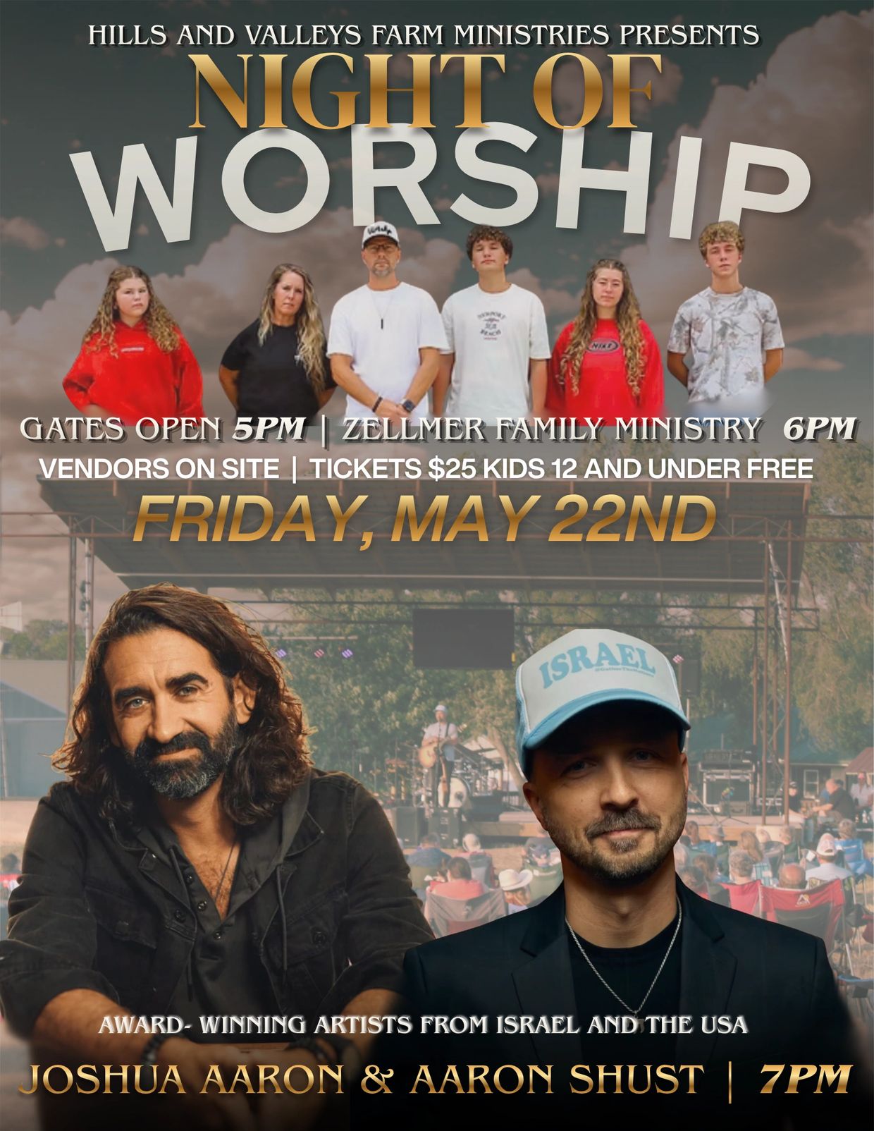 Get ready for an unforgettable evening of worship with Aaron Shust and Joshua Aaron live in person, outside! Come out for a time of powerful worship and inspiring moments as these incredible artists lead us in praise and adoration to our King, Jesus. Bring your friends, families, and your passion for worship. Don't miss out on a night under the skies of Kansas in the Hills and Valleys to bring praise to our Lord! Kids 12 and under are free! Messianic dance is encouraged!